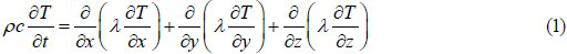 T为瞬态温度、t为时间、λ为导热系数、ρ为物体的质量密度、c为比热容、x、y、z为直角坐标。