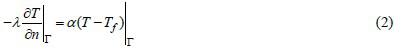火灾开始前,结构多处于环境温度状态,假设结构内部温度均匀且等于环境温度T0。发生火灾时,边界条件则视结构所处环境、与周围介质的换热等而不同,一般可分为三类。钢筋混凝土结构一般取第三类边界条件,即: 与结构相接触的流体介质温度Tf(结构表面附近的空气温度)和综合换热系数α为已知,用公式表示为